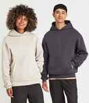 Cotton faced fabric. Brushed back fleece. Drop shoulder style. Oversized fit. Three panel double fabric hood. Front pouch pocket with inner media pocket. Ribbed cuffs and hem. Twin needle stitching. Tear out label.